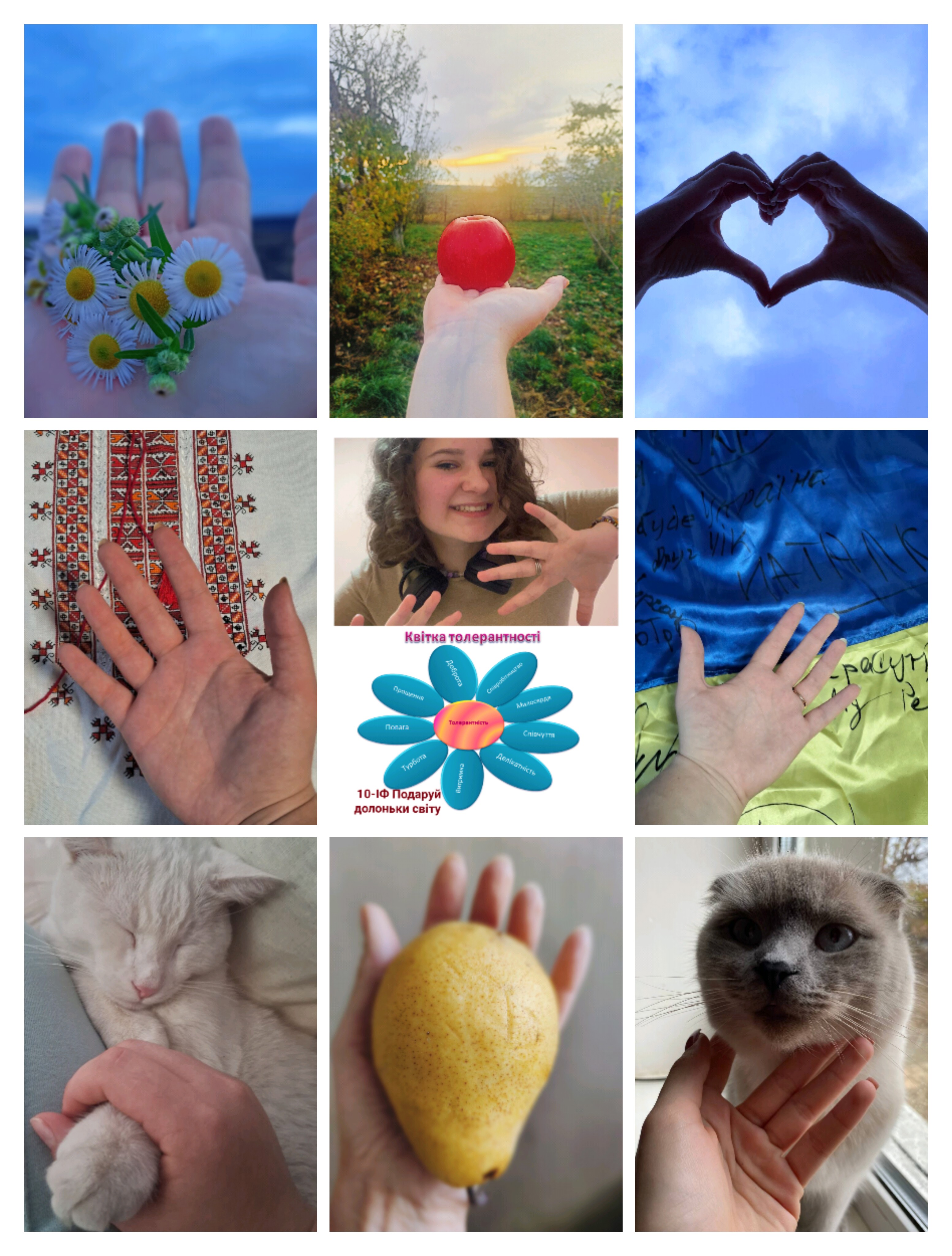 Роботи ліцеїстів до Дня толерантності: 10-11 класи взяли участь у челенджі "Подаруй долоньку світу", 8-9 класи підготували колажі "Долоньки толерантності".