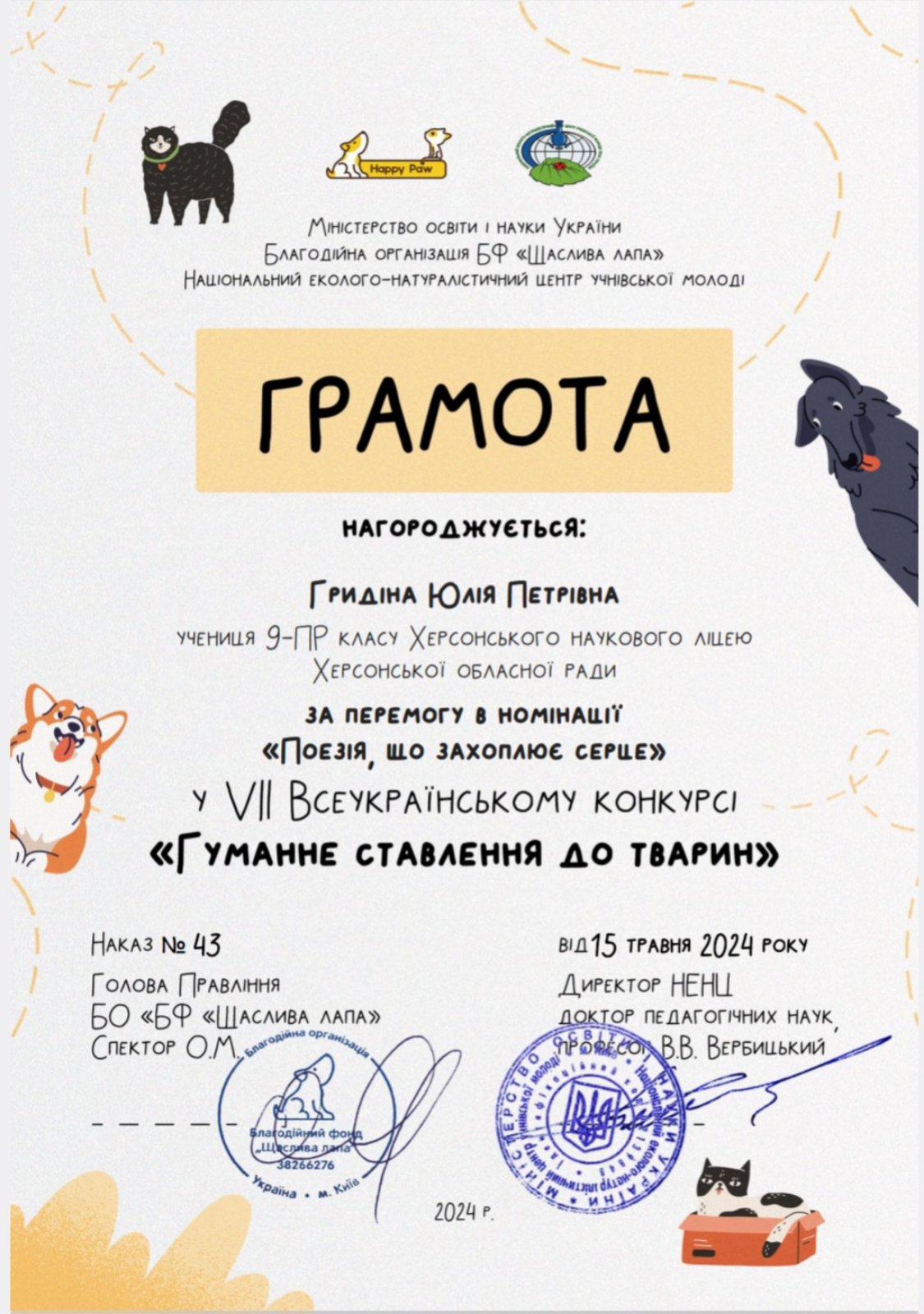 Благодійна організація БФ "Щаслива лапа" Національного еколого-натуралістичного центру учнівської молоді провела VII Всеукраїнський конкурс " Гуманне ставлення до тварин". Учениці 9 ПР класу Гридіна Юлія та Пилипейко Валерія взяли участь у конкурсі: вітаємо Гридіну Юлію з перемогою у номінації "Поезія, що захоплює серце!