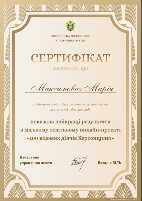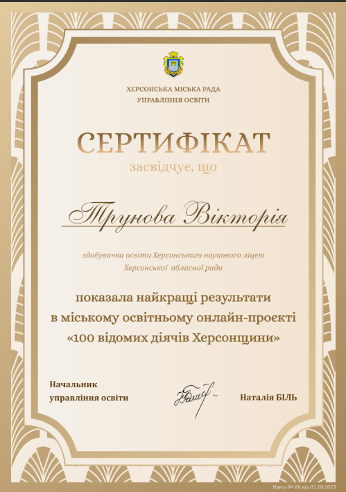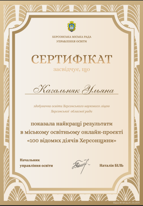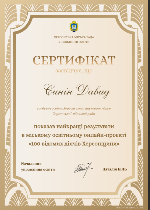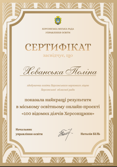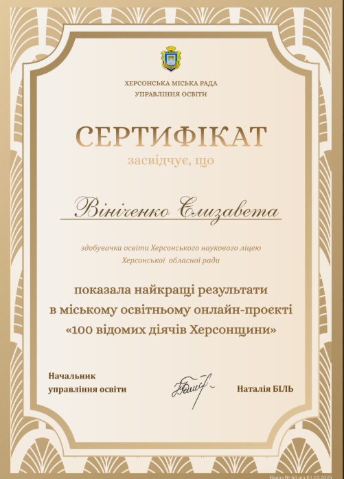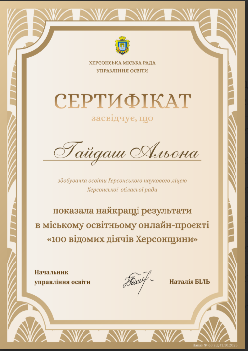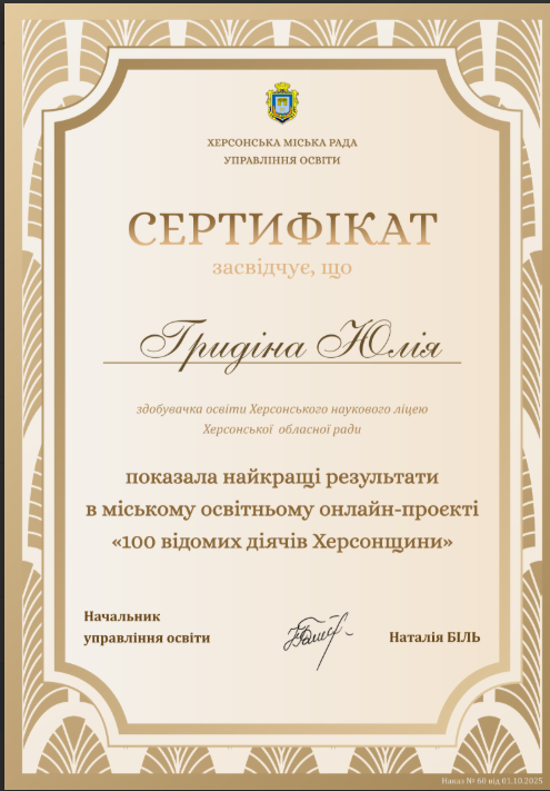 Учні 11 ІФ класу взяли участь у міському краєзнавчому проєкті «100 відомих діячів Херсонщини» і продемонстрували глибокі знання, креативність і любов до рідного краю. Вони показаши одні з найкращих результатів серед учасників!