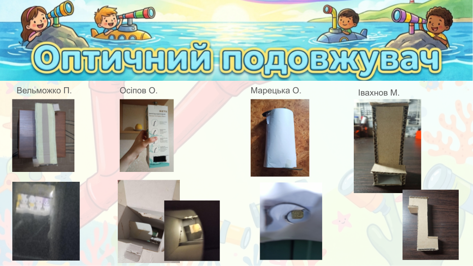Оптичний подовжувач: бачити неможливе! Учні Вельможко П., Осіпов О., Марецька О. та Івахнов М. (9 клас) створили пристрої, які дозволяють зазирнути за кут, вище та далі! Це просто фантастика — власноруч зібрати перископ і відчути себе справжнім дослідником таємних світів.