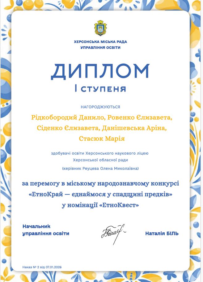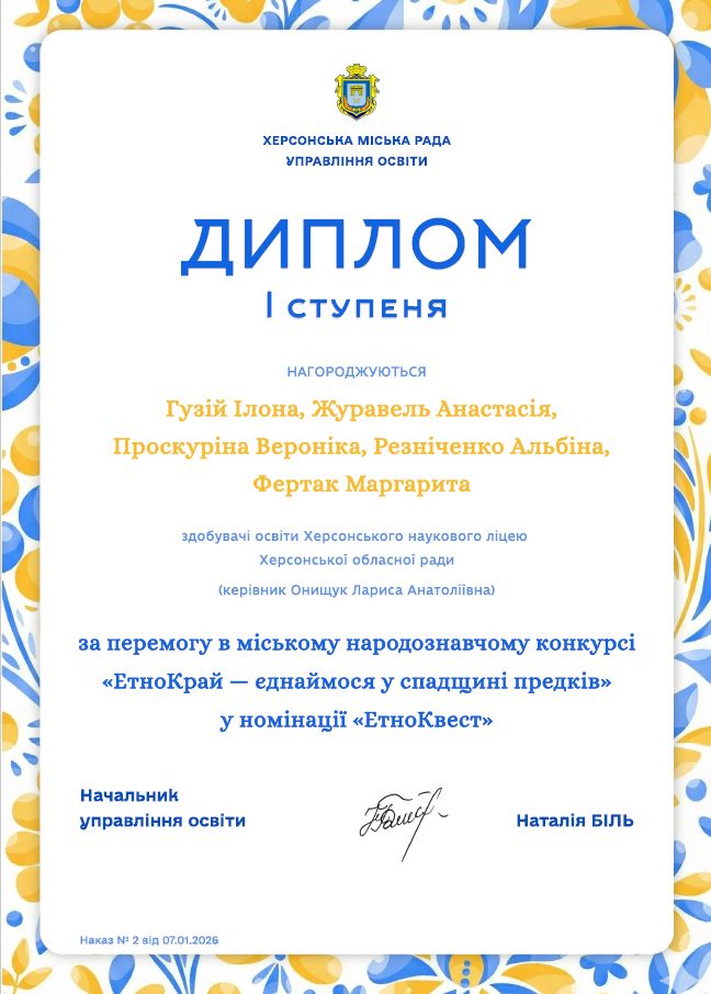 Здобувачі освіти 8 і 10 ІФ класів Херсонського наукового ліцею Херсонської обласної ради здобули перемогу в міському народознавчому конкурсі «ЕтноКрай — єднаймося у спадщині предків» у номінації «ЕтноКвест».